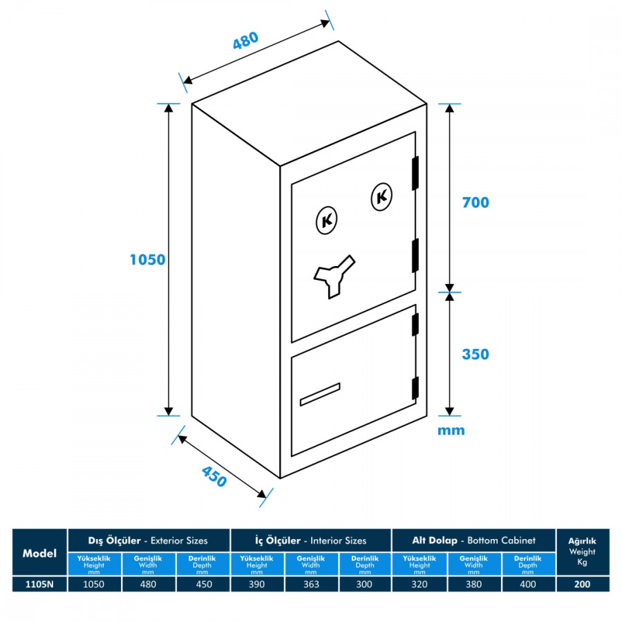 Model 1105N-KK Ofis Tipi Çelik Kasa, şık tasarımı ve sağlam yapısıyla ofisler için ideal bir koruma çözümü sunuyor. Çelik malzemeden üretilen kasa, değerli eşyalarınızı güvenle saklamaya ve korumaya yardımcı olur. Üstün güvenlik özellikleri ve dayanıklı yapısıyla, sizin için önemli olan her şeyi korumak için tasarlanmıştır.