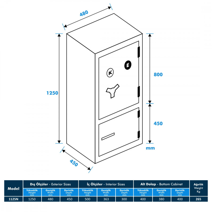 1125N-KE modeli, ofis ortamlarında güvenlik için tasarlanmış bir çelik kasa ürünüdür. Dayanıklı ve sağlam çelik malzemeden üretilmiştir ve çelik kaplamaya sahiptir. Üst düzey güvenlik sağlamak için 4 adet katlanır kilit sistemi bulunmaktadır.