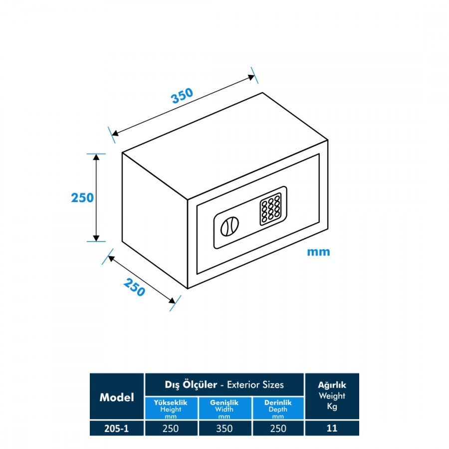 205-1 modeli, üç basamaklı bir şifre sistemi ile kullanıcıların kolayca açabilmesi için tasarlanmıştır. Ayrıca, dijital tuş takımı ile kolay bir şekilde programlanabilmektedir. Şifre sisteminin yanı sıra, acil durumlarda kullanılabilecek bir acil anahtar da kasaya dahil edilmiştir.