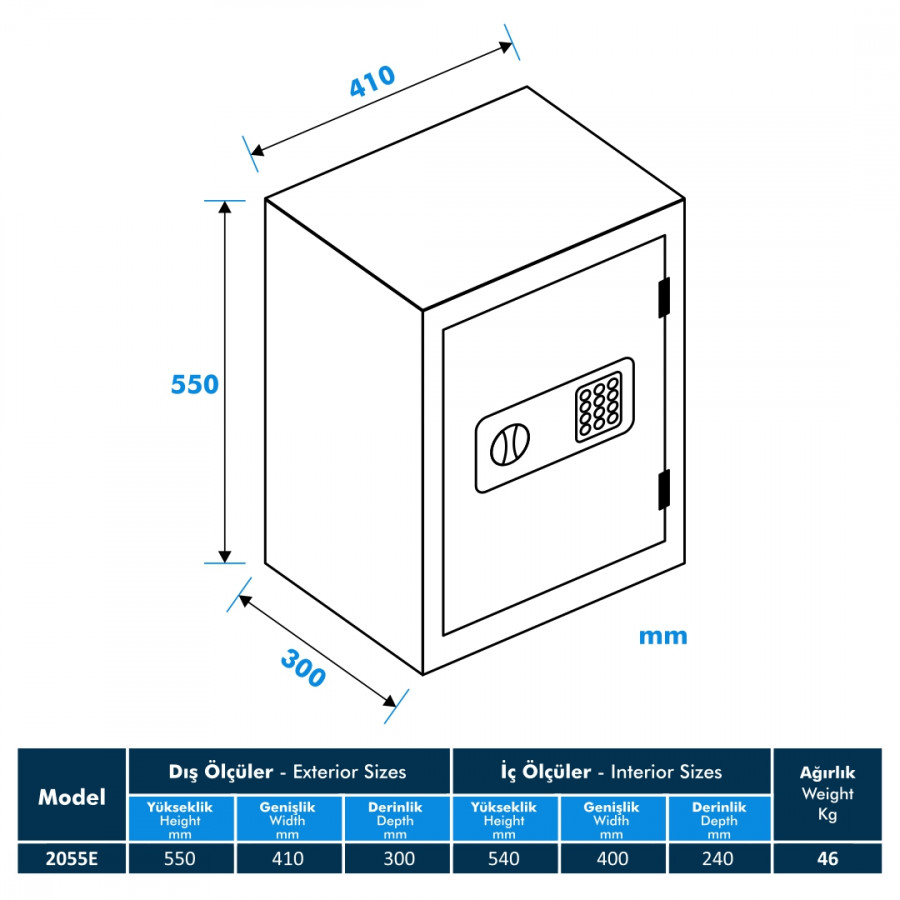 Model 2055-E Elektronik Ev ve Ofis Kasa, güvenliğe önem veren herkesin ihtiyacını karşılayacak bir üründür. Zengin bir içeriğe sahip olan bu kasa, ev ve ofislerde bulunan önemli evraklar, değerli eşyalar ve nakit paraların saklanması için ideal bir seçenektir.