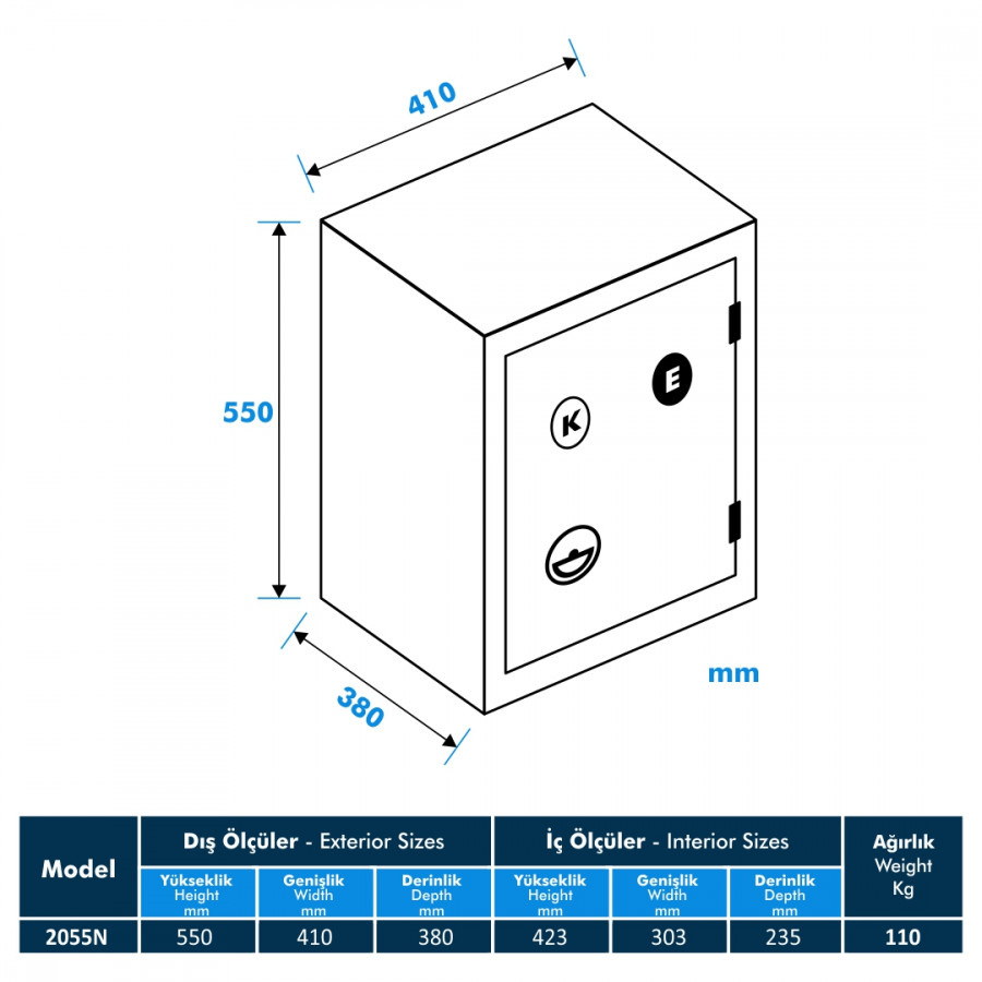 Model 2055N-KE, dayanıklı çelik malzemeden üretilmiştir ve içindeki eşyalarınızı dış etkenlere karşı korumanın en etkili yoludur. Ayrıca, çift duvarlı kapısı ve ağır hizalı gövdesi sayesinde, kasanızın içindeki eşyalarınızı yangın ya da su gibi dış tehlikelere karşı da korur.