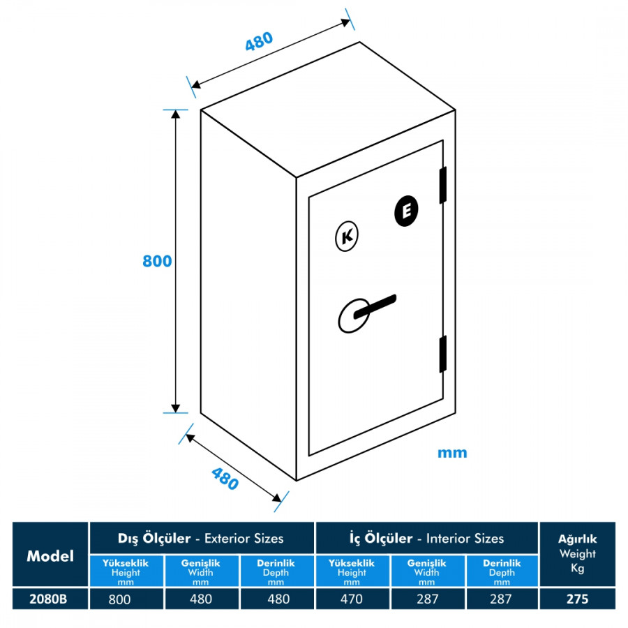 Model 2080B-KE Ev ve Ofis Çelik Kasa, modern tasarımı ve sağlam yapısıyla güvenliğinizi ve değerli eşyalarınızın korunmasını sağlamak için tasarlanmıştır. Bu kasa, hem evlerde hem de iş yerlerinde kullanılabilecek şekilde üretilmiştir.