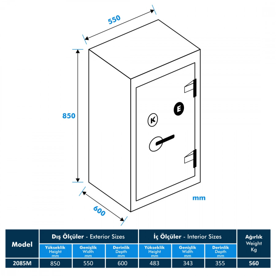 Model 2085M-KE Yüksek Güvenlikli Çelik Kasa, değerli eşyalarınızı ve önemli belgelerinizi güvenle saklamak için tasarlanmıştır. Son derece dayanıklı ve sağlam yapısı sayesinde, çelik kasamız evlerinizde, iş yerlerinizde veya herhangi bir işletmede kullanılmak üzere ideal bir seçenektir.