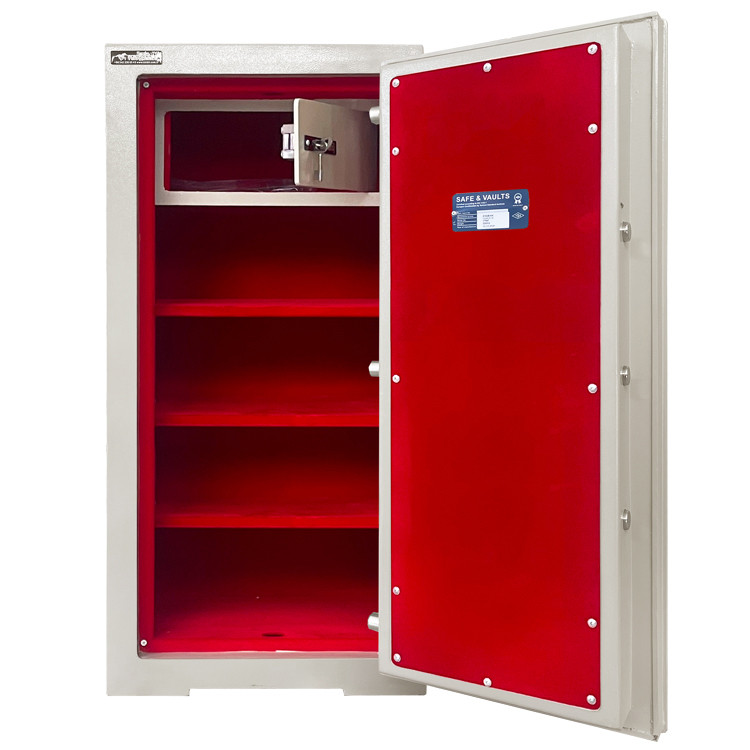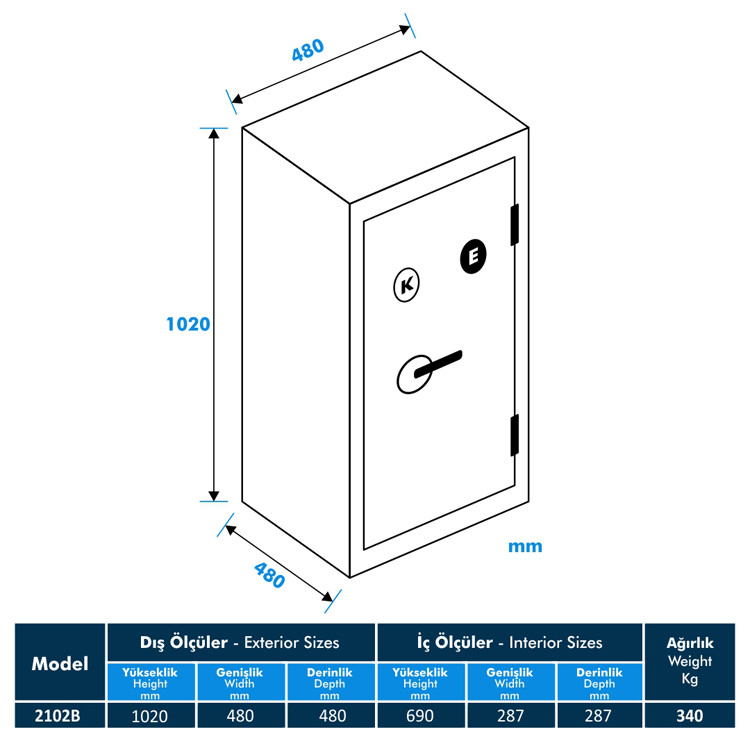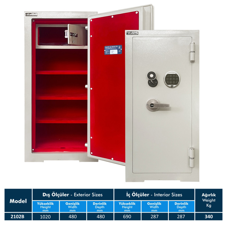 Model 2102B-KE, bir anahtarlı ve bir elektronik yüksek güvenlikli kilit sistemi ile donatılmıştır. Bu özellik, eşyalarınızın güvenli bir şekilde saklanmasını sağlar ve sadece sizin ya da yetkili kişilerin erişebilmesini garanti eder. Kasanın kapısında bulunan kilitleme noktaları, her türlü zorlamaya karşı dayanıklıdır ve kasanızı korumak için güçlendirilmiştir.