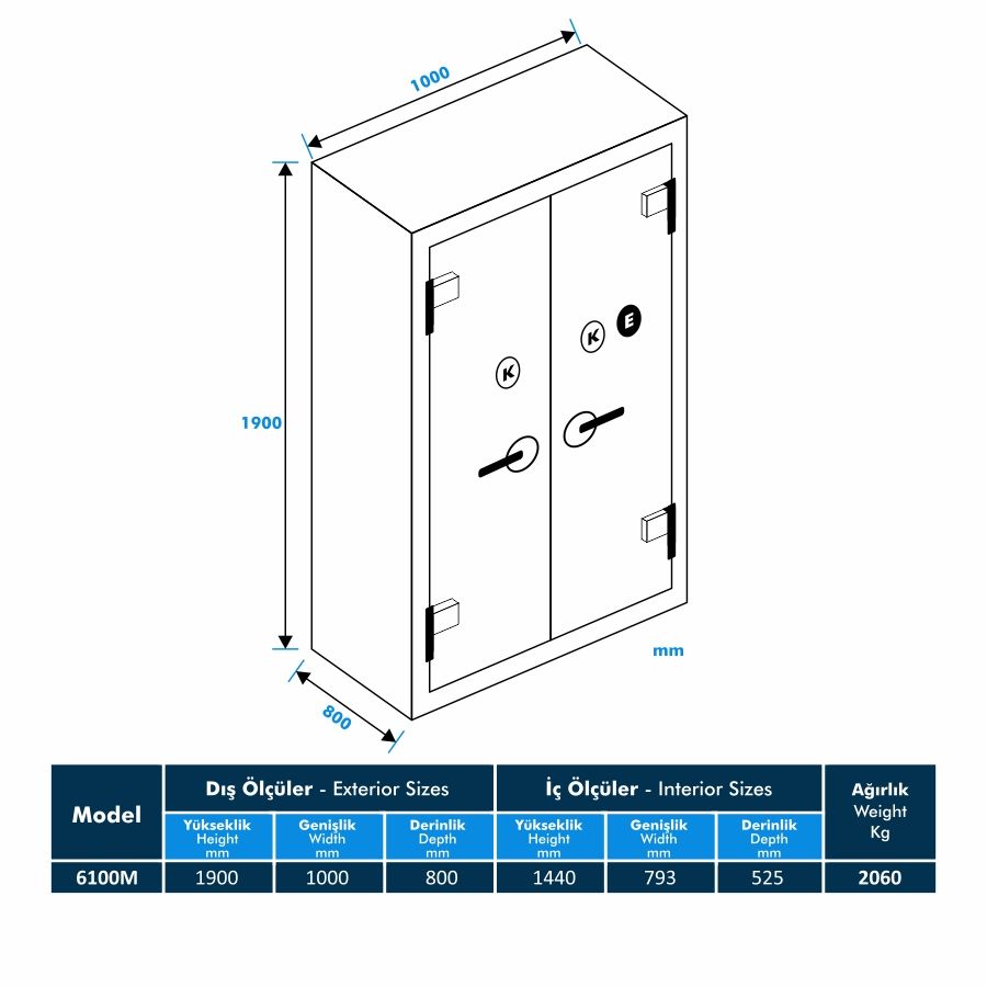 6100M-KE Yüksek Güvenlikli Çelik Kasa, dayanıklılığı ve özellikleriyle evlerde, ofislerde, bankalarda, otellerde ve diğer birçok alanda tercih edilmektedir. Hijyenik ve kullanışlıdır, alanınızın düzenini bozmadan yerleştirilebilir ve içerisine özellikle değerli eşyalarınızı saklayabilirsiniz.