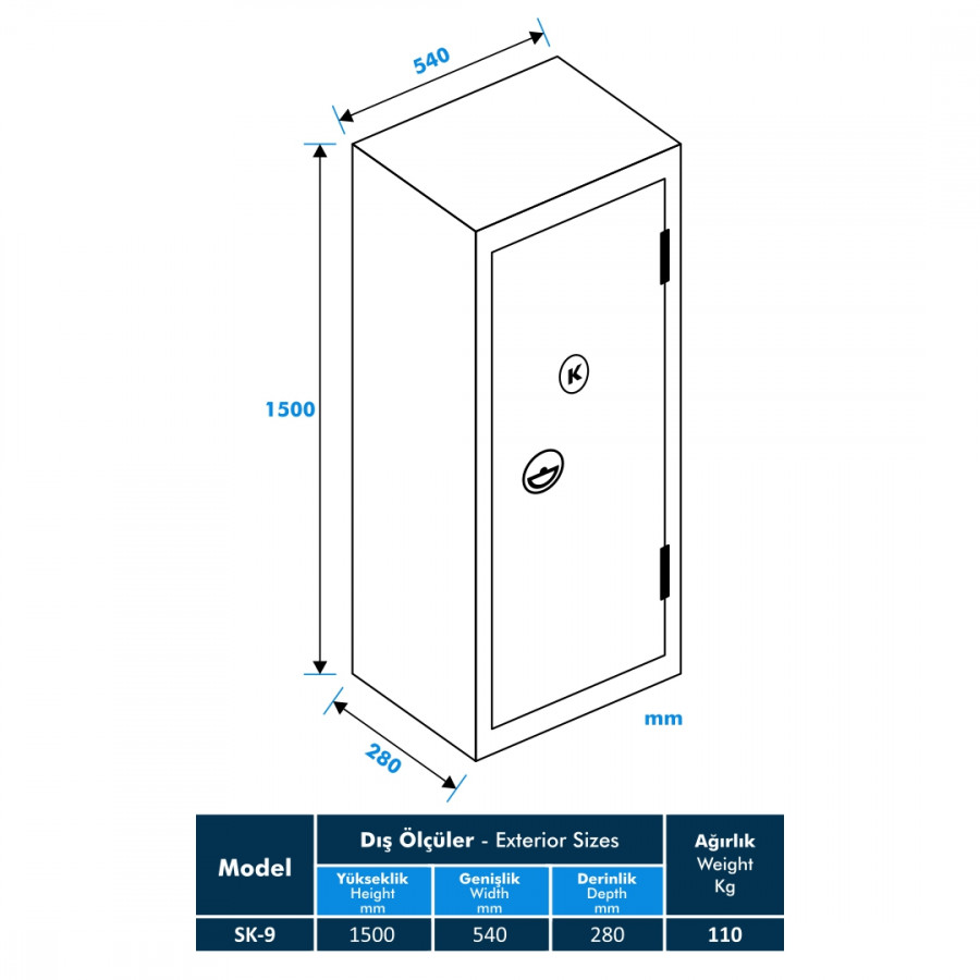 Model SK-9 Kadifeli Silah ve Tüfek Kasa, iç kısmında kullanıcıların isteğine göre değiştirilebilen dolap rafları ve bölmeleri ile geniş bir depolama alanı sunar. Bu sayede, silahlarınızın ve tüfeklerinizin yanı sıra, mühimmat ve diğer güvenlik ekipmanlarınızı da düzenli bir şekilde saklayabilirsiniz. Kasa içindeki aydınlatma sistemi sayesinde, düşük ışık koşullarında bile eşyalarınızı kolaylıkla bulabilirsiniz.